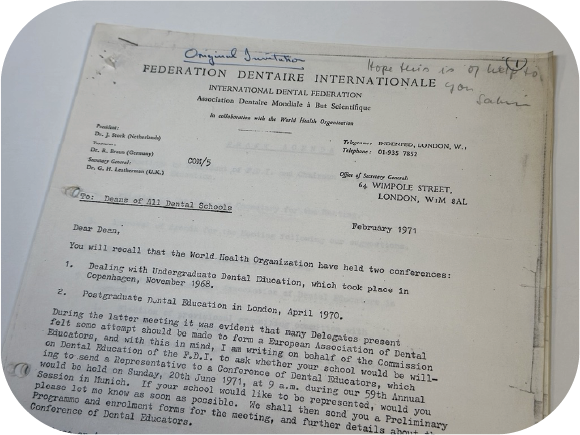 Stemming from two World Health Organisation sponsored meetings concerning dental education; undergraduate (1968 Copenhagen); post graduate (1970 London), and facilitated through the Fédération Dentaire Internationale (FDI), European dental school deans were invited to attend a meeting in Munich in Feb 1971 to explore the need and opportunity to create an association for dental educators in Europe.